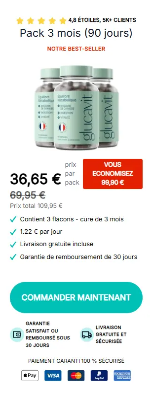 Compte tenu de la popularité et du succès de Glucavit, il pourrait bien être le véritable changement dont les personnes souffrant d’obésité ont besoin depuis longtemps. Glucavit agit en douceur et aide le corps à se transformer sans effets stimulants ni sensations de nervosité ou de tremblements. Les avis des clients indiquent qu’ils ont constaté une meilleure endurance et davantage de force, ce qui n’est pas quelque chose que les méthodes classiques de perte de poids offrent généralement. Sachant cela, revenir aux régimes à la mode et aux séances d’entraînement interminables semble être une mauvaise idée, alors qu’il est possible d’obtenir les mêmes résultats grâce à un simple changement de mode de vie et à Glucavit.